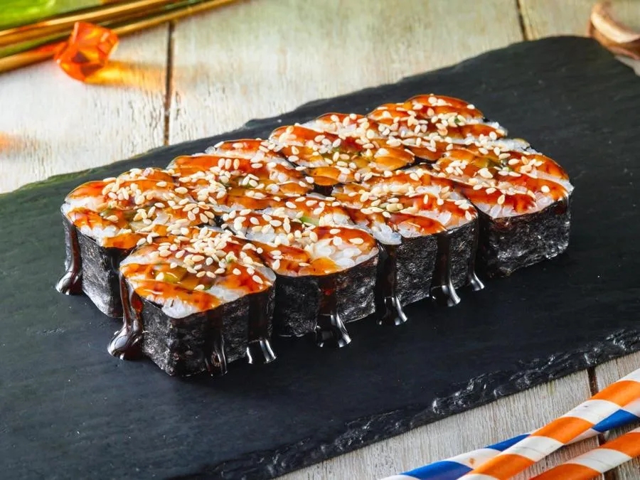 Копченый угорь, сыр, огурец, острый соус Табаджан, кунжут, соус Унаги
