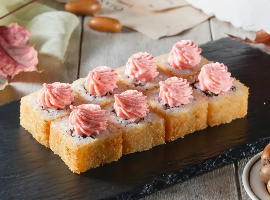 Курица, сливочный сыр, огурец, обжаренные в темпуре и политые императорским соусом