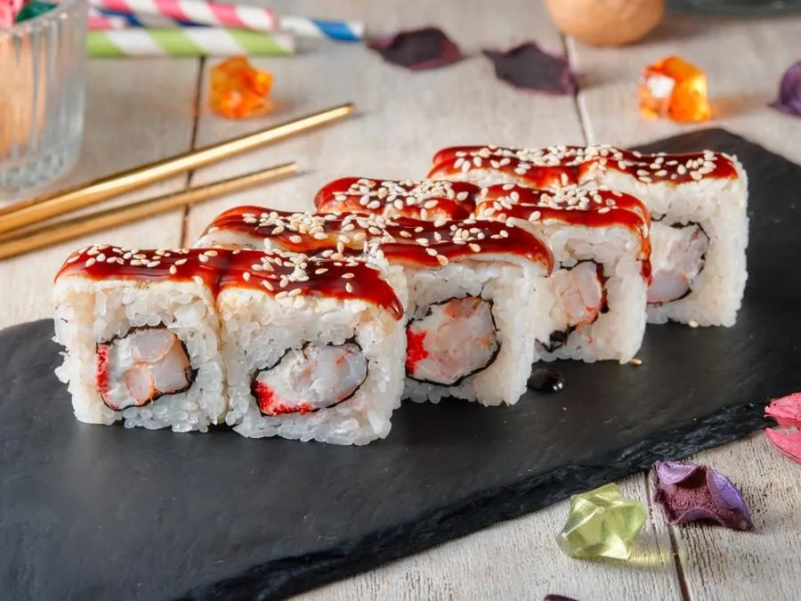 Креветки, сливочный сыр, огурец, сливочный крем-соус, соус Унаги, кунжут