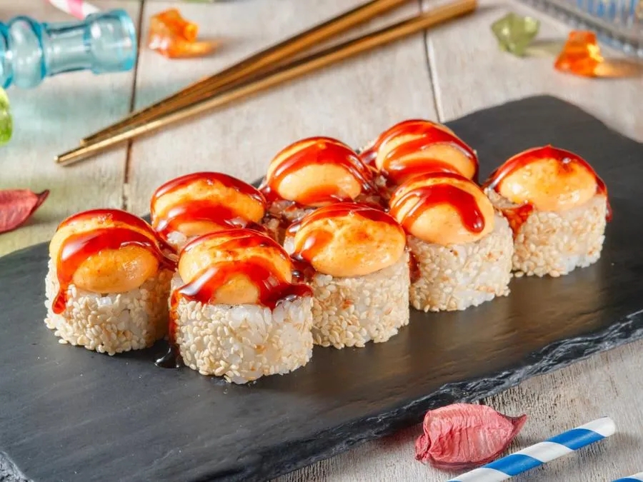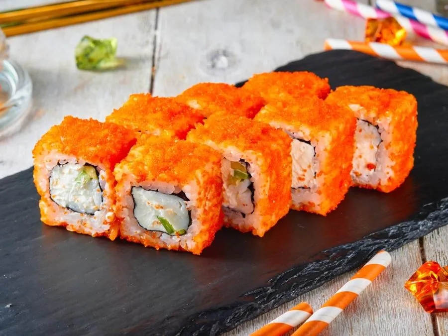 Креветки, краб, зеленый лук, масаго, соус спайси, кунжут