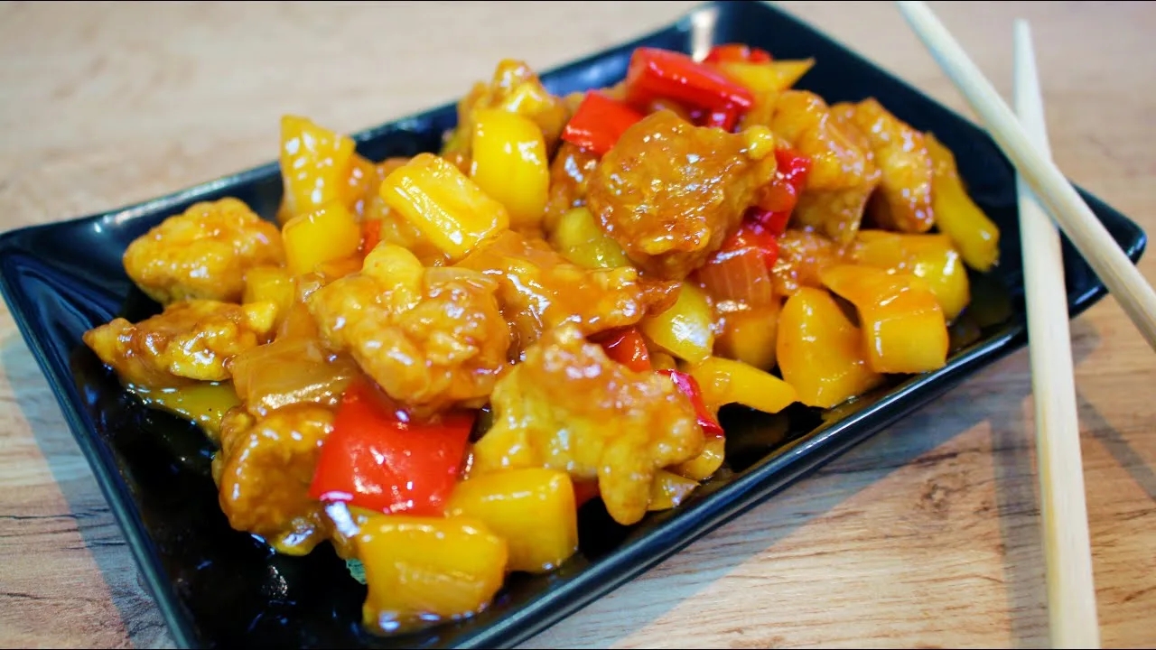 Свинина в кисло-сладком кляре, морковь, лук репчатый