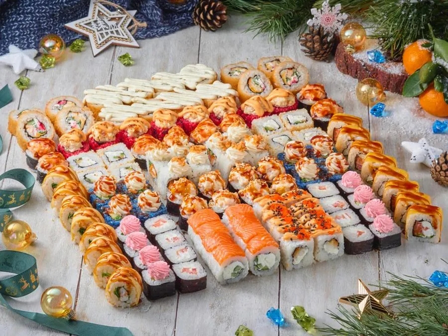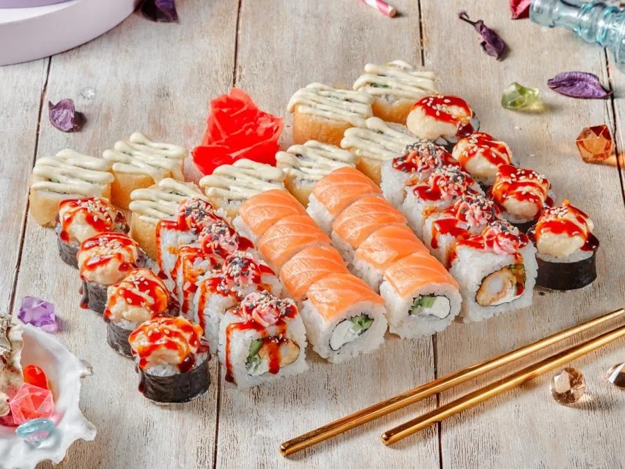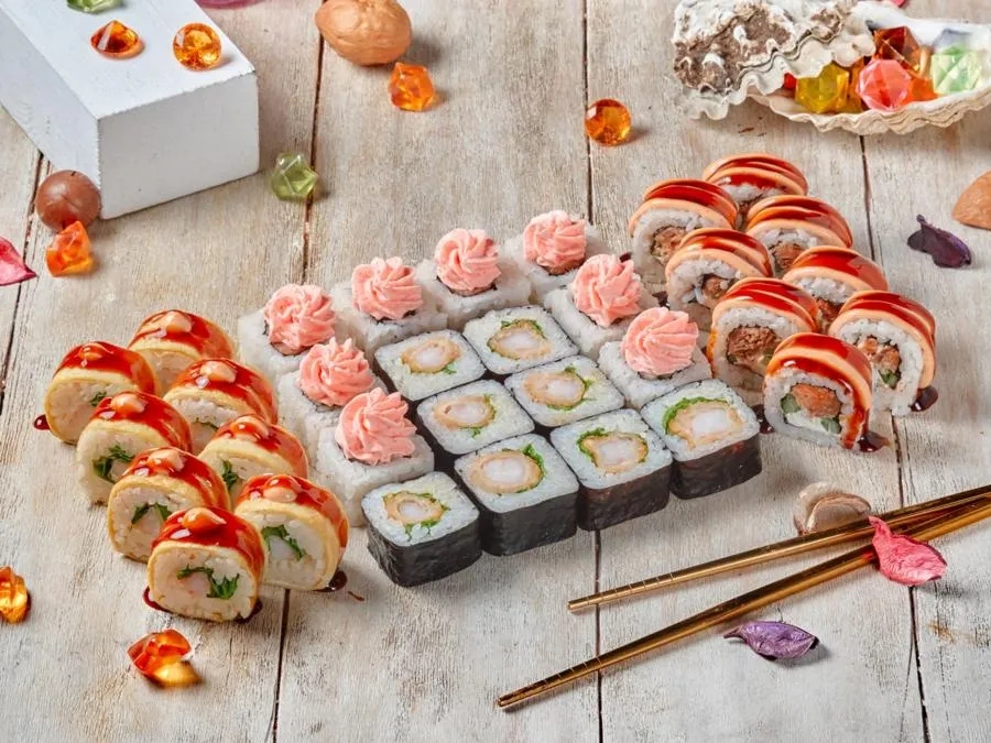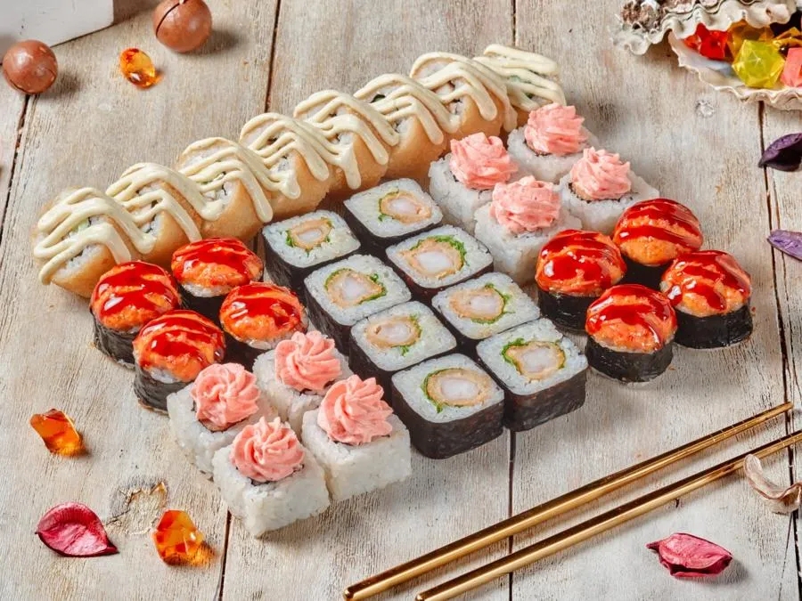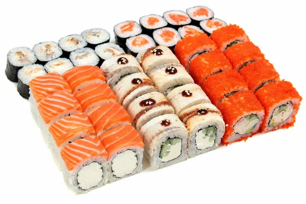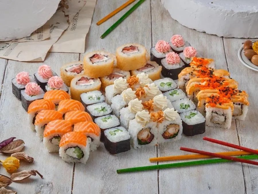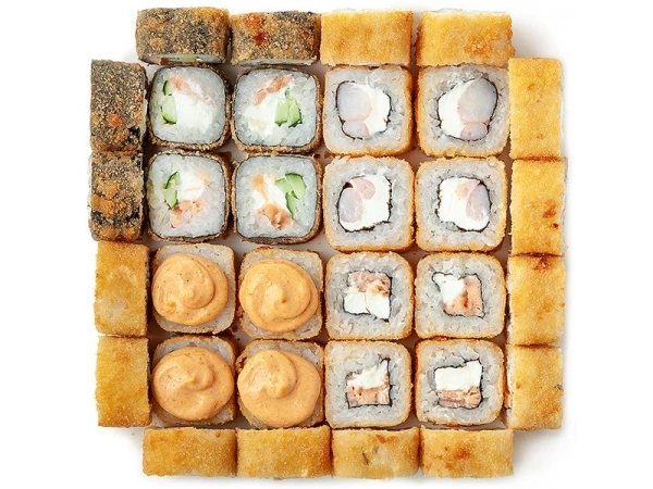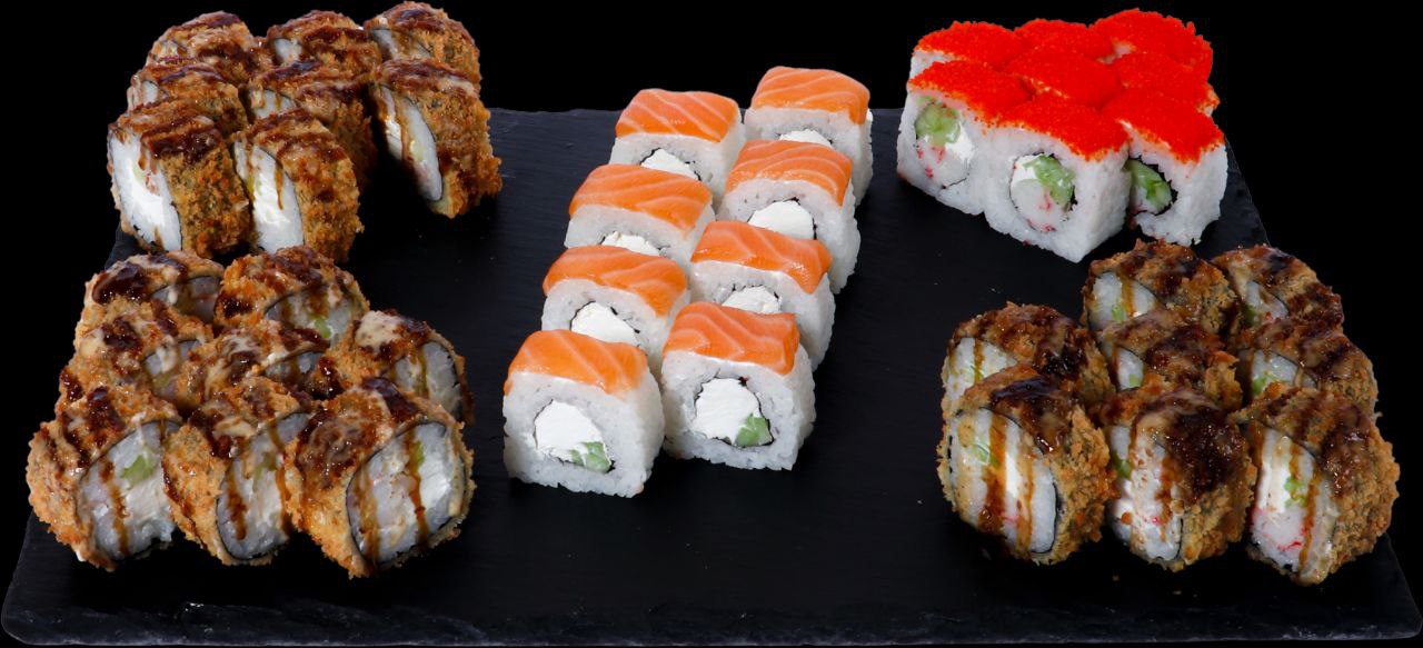 Фила классик, Калифорния с крабом, Бонито, Кунсей маки, Унаги маки, Каппа маки, Аригато с курицей (ГРИЛЬ), Мастер (ГРИЛЬ), Сурими (ГРИЛЬ), Горячий беконсан, Лотос, Чикен Темпура