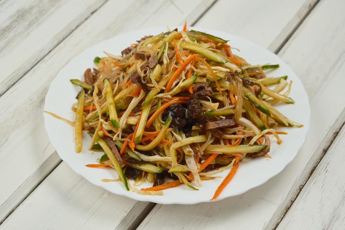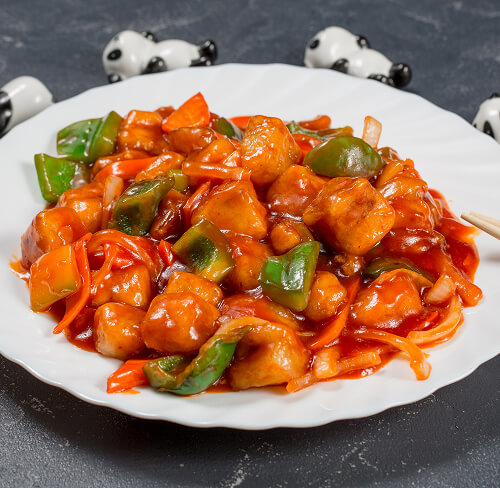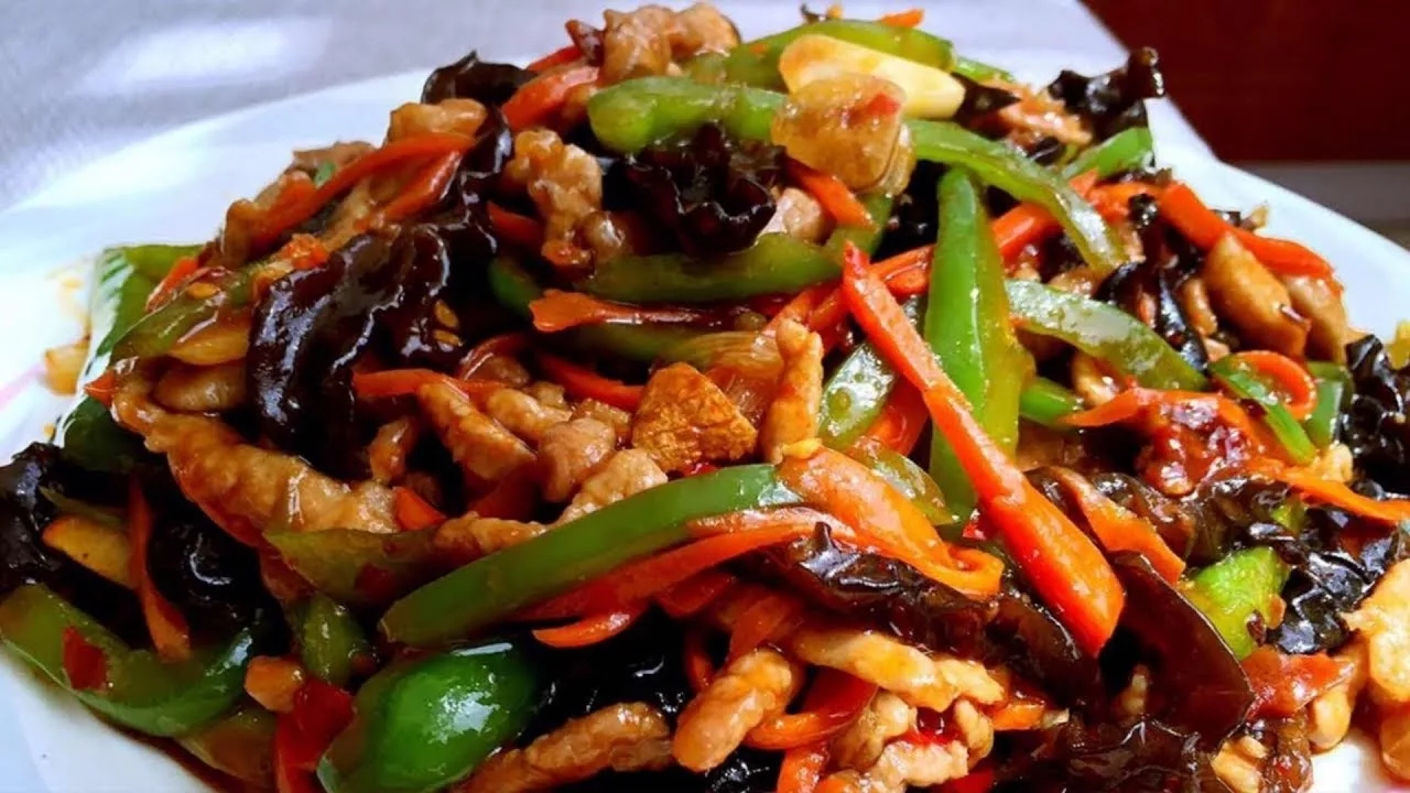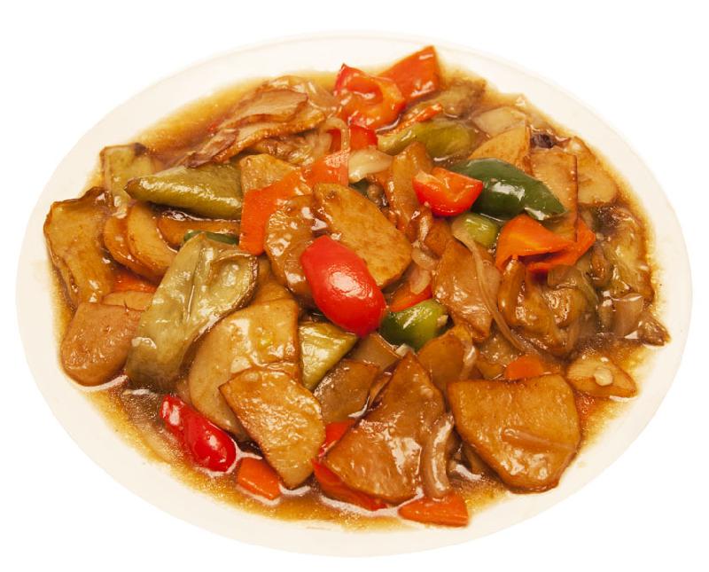 Свинина, болгарский перец, морковь, древесные грибы, кисло-сладкий соус