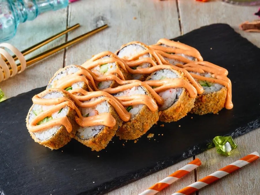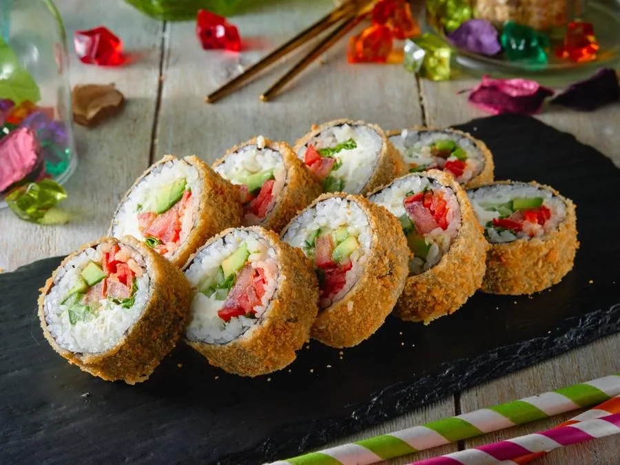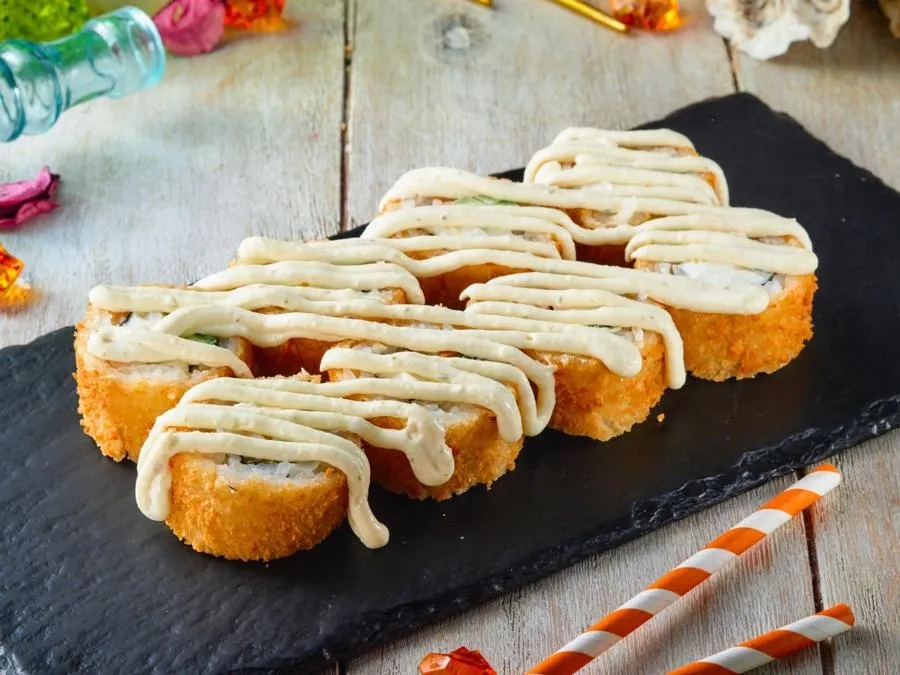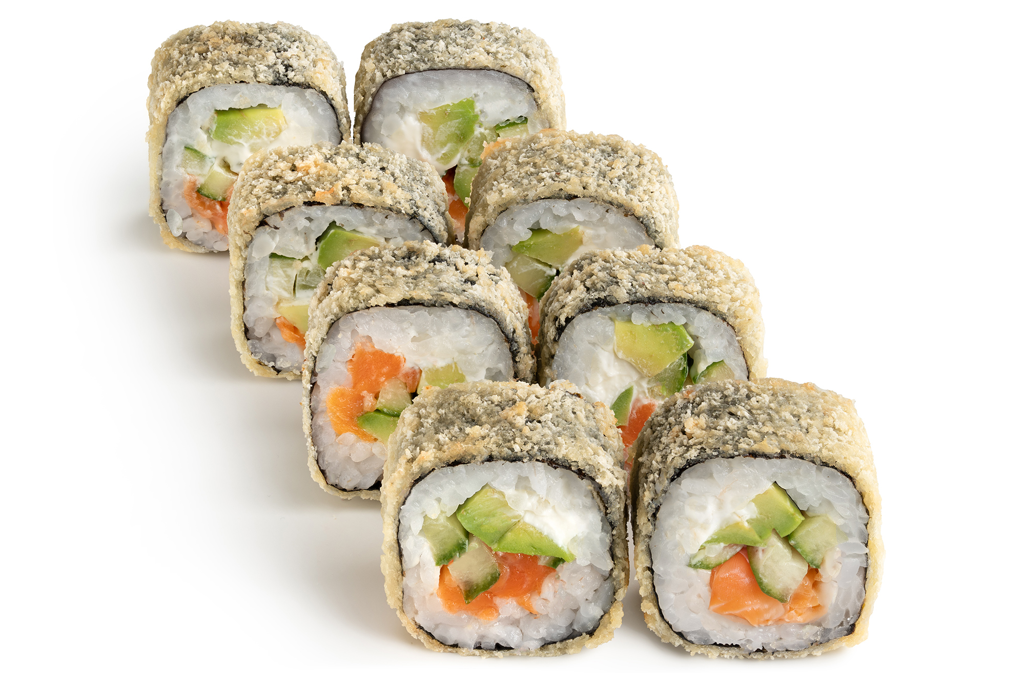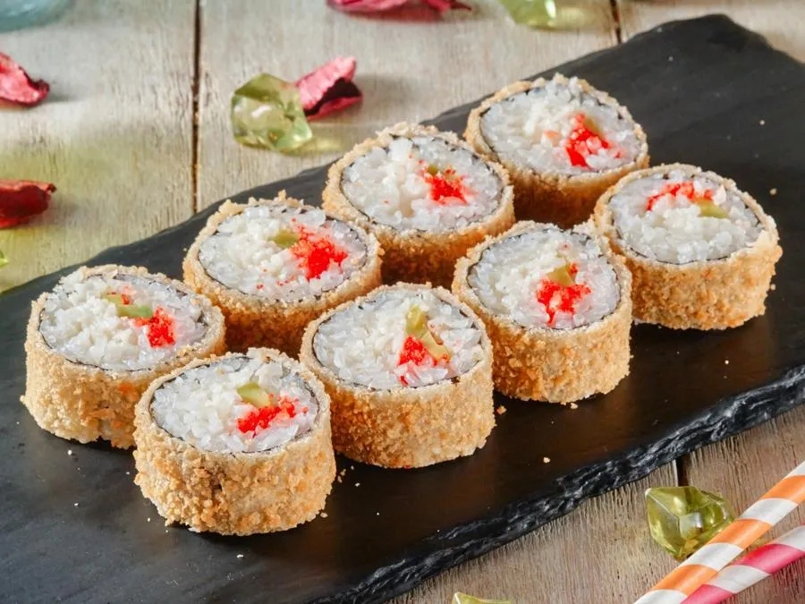 Рис, водоросли нори, краб крем, авокадо, икра масага, кляр, сухари панко