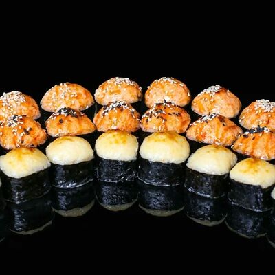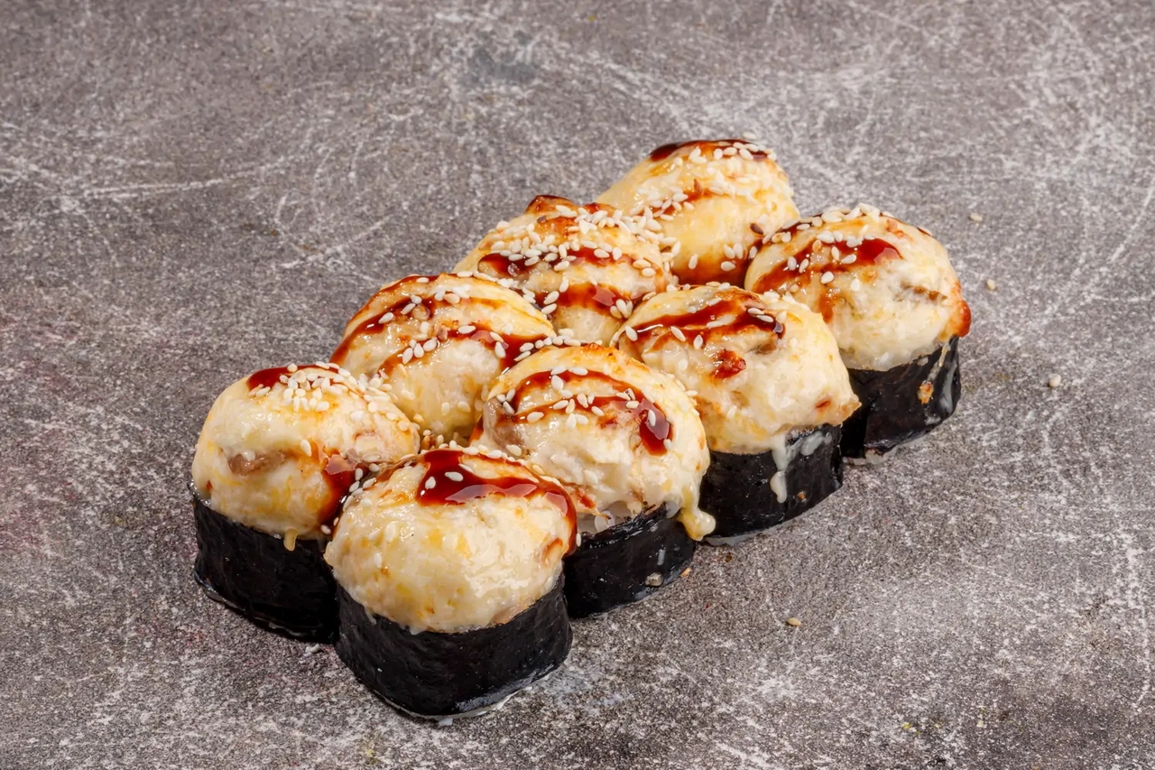 Угорь, краб-крем, сыр сливочный, соус сырный для запекания, кунжут, соус унаги