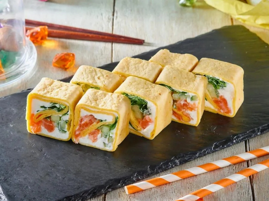 Лосось, омлет томаго, огурец, сыр, соус лава, лук фри