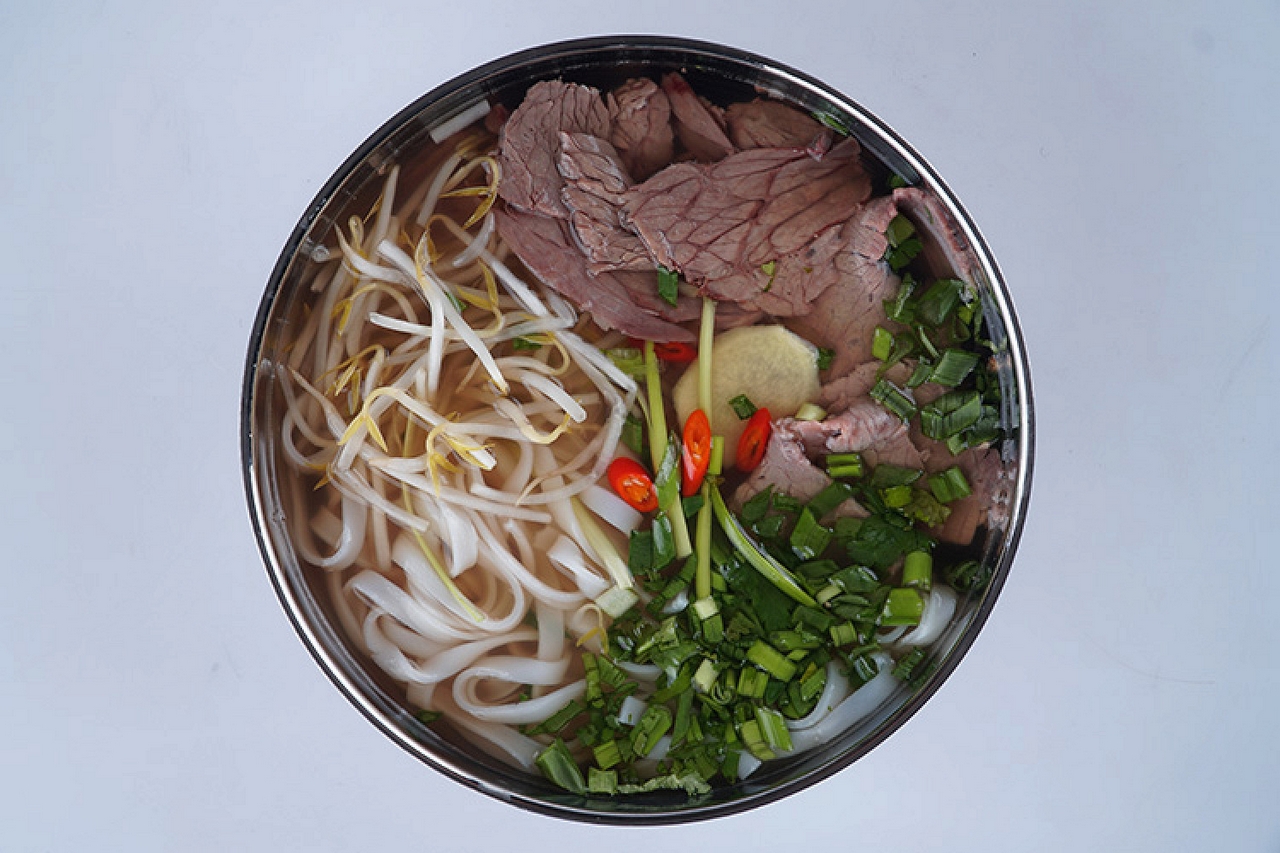 Суп Фо с говядиной, рисовой лапшой, имбирем и луком. Подаётся с лаймом, зеленью, острым перцем