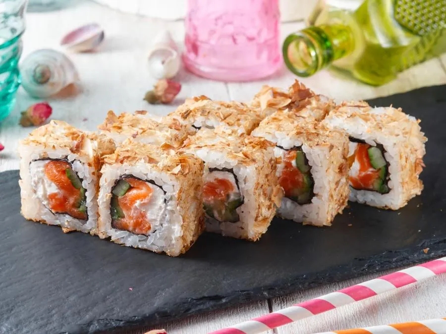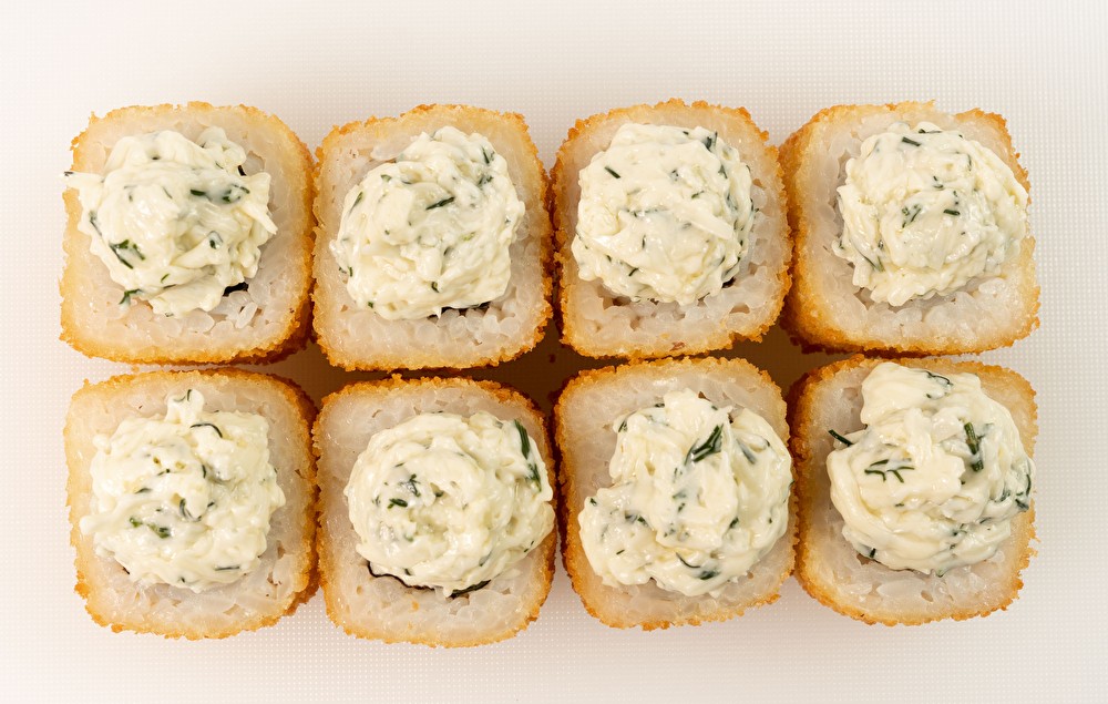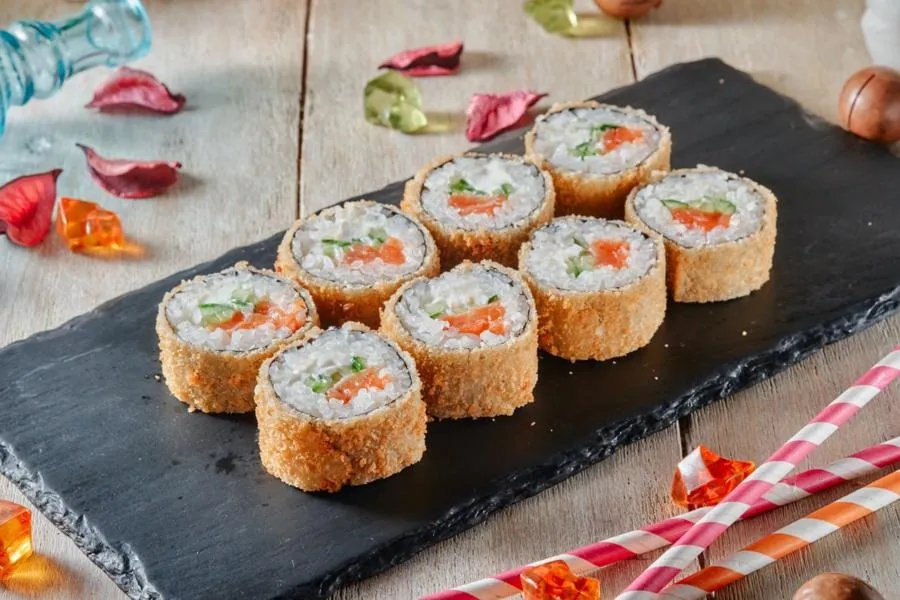 Рис, водоросли нори, сыр твороженный, лосось, огурец, кляр, сухари панко