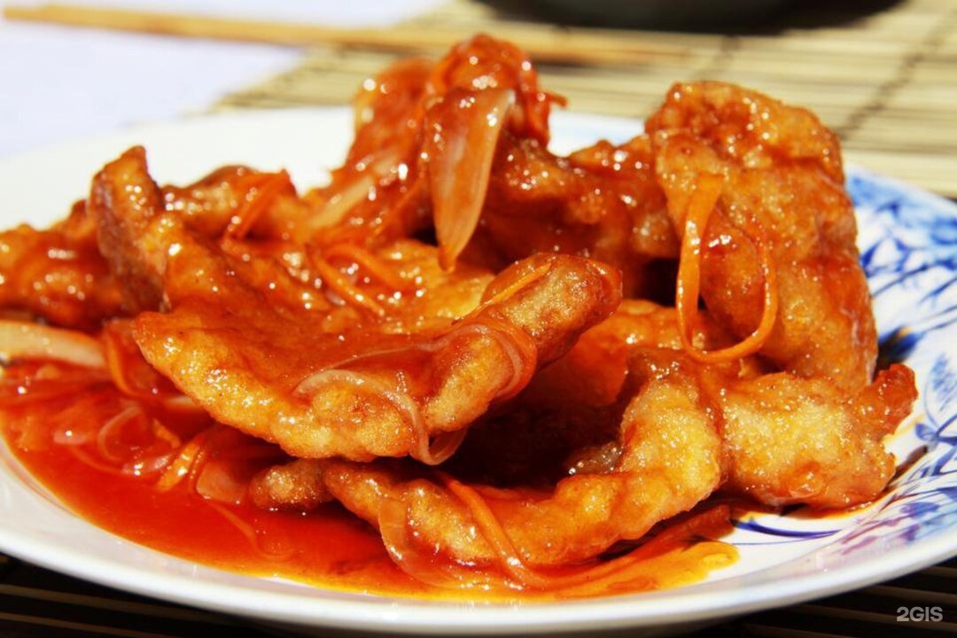 Свинина в кисло-сладком кляре, морковь, лук репчатый