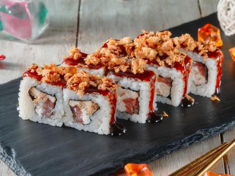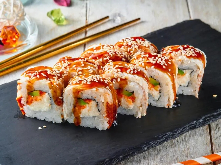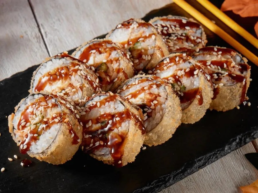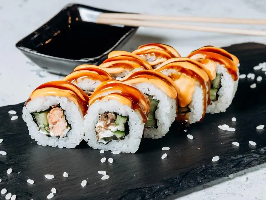 Копченый угорь, сыр, огурец, острый соус Табаджан, кунжут, соус Унаги