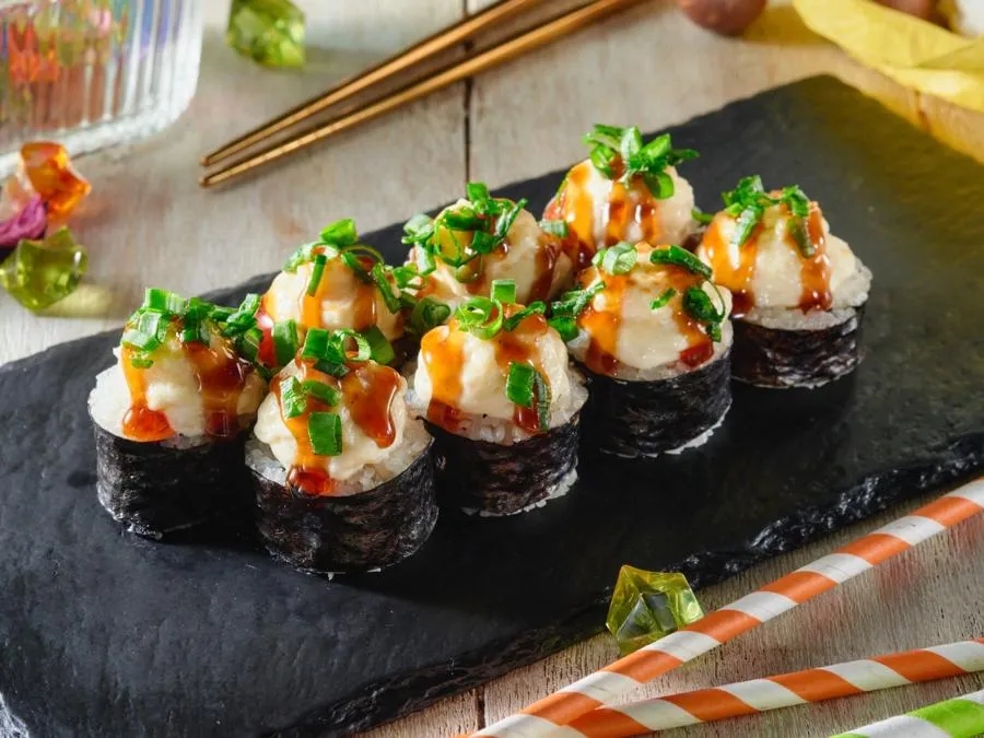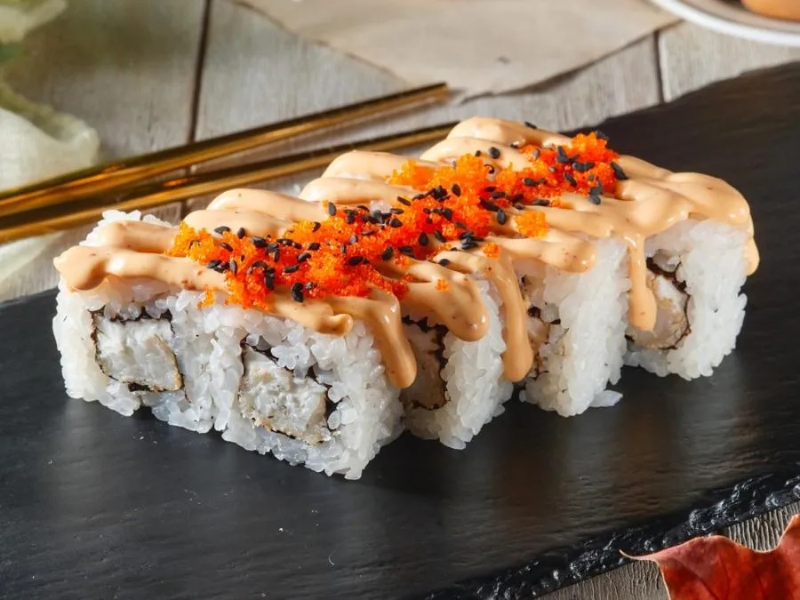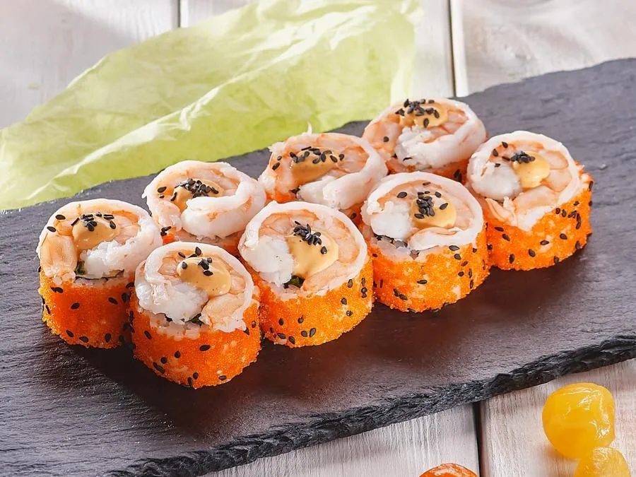 Креветки, краб, зеленый лук, масаго, соус спайси, кунжут