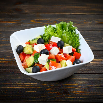 Перец, лук, огурец, заправка, помидор, сыр фетакса, маслины