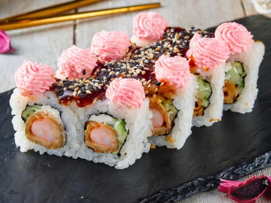 Креветки, сливочный сыр, огурец, сливочный крем-соус, соус Унаги, кунжут