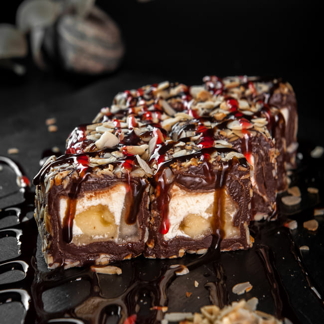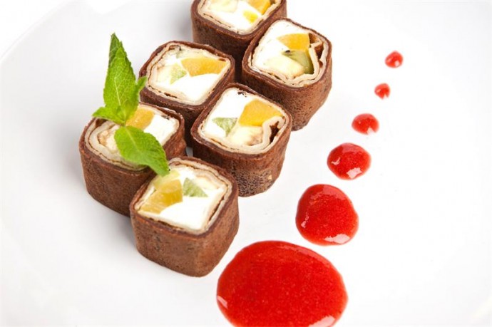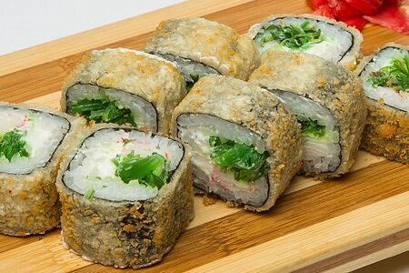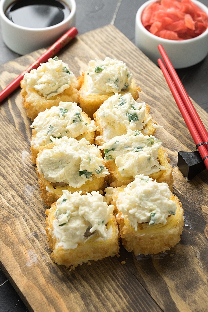 Курица, сливочный сыр, огурец, обжаренные в темпуре и политые императорским соусом