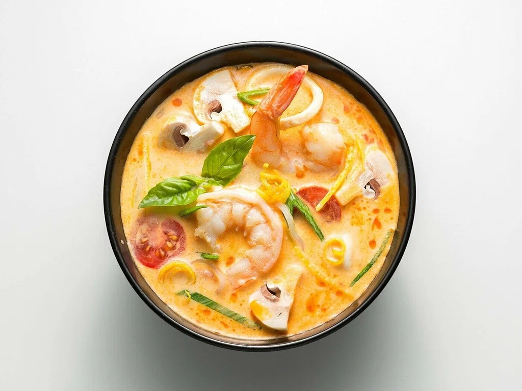Паста том-ям, тигровые креветки, томаты черри, грибы шампиньоны. Подается с зеленью, перцем чили и паровым рисом