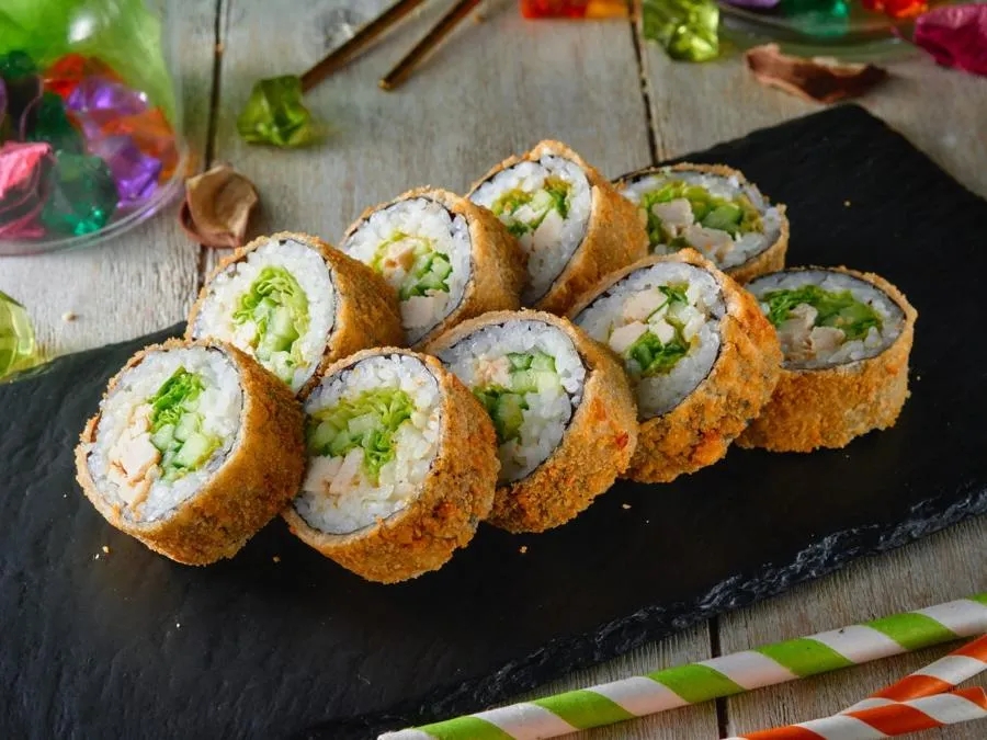 Рис, водоросли нори, сыр твороженный, лосось, огурец, кляр , сухари панко