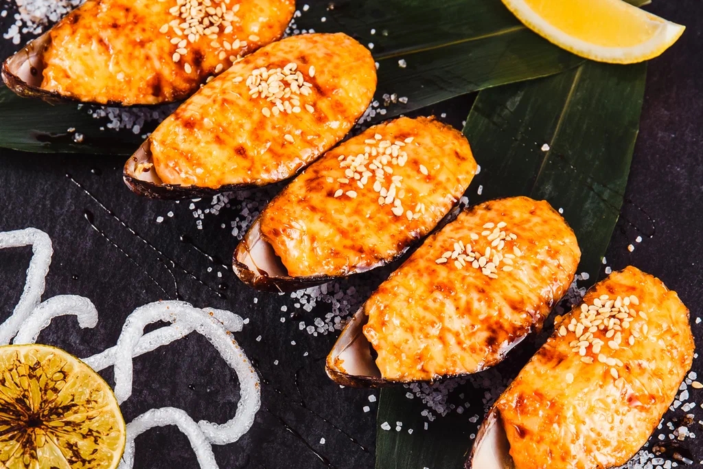 Мидии под сыром пармезан на рисовой подушке (5 шт)