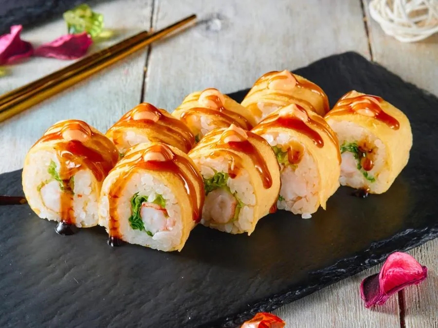 Креветка, сливочный сыр, огурец,императорским соусом, обжарен в темпуре