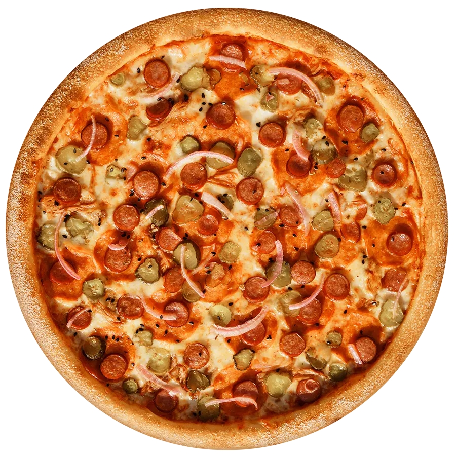 Тесто, томатный соус, сыр моцарелла, прованские травы, соленый огурчик, охотничьи колбасы (32 см)