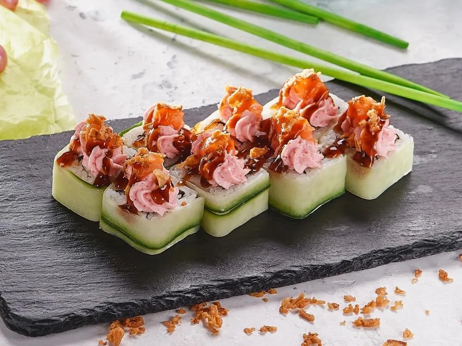 Сливочный сыр, огурец, сливочный крем-соус, соус Унаги, зеленый лук