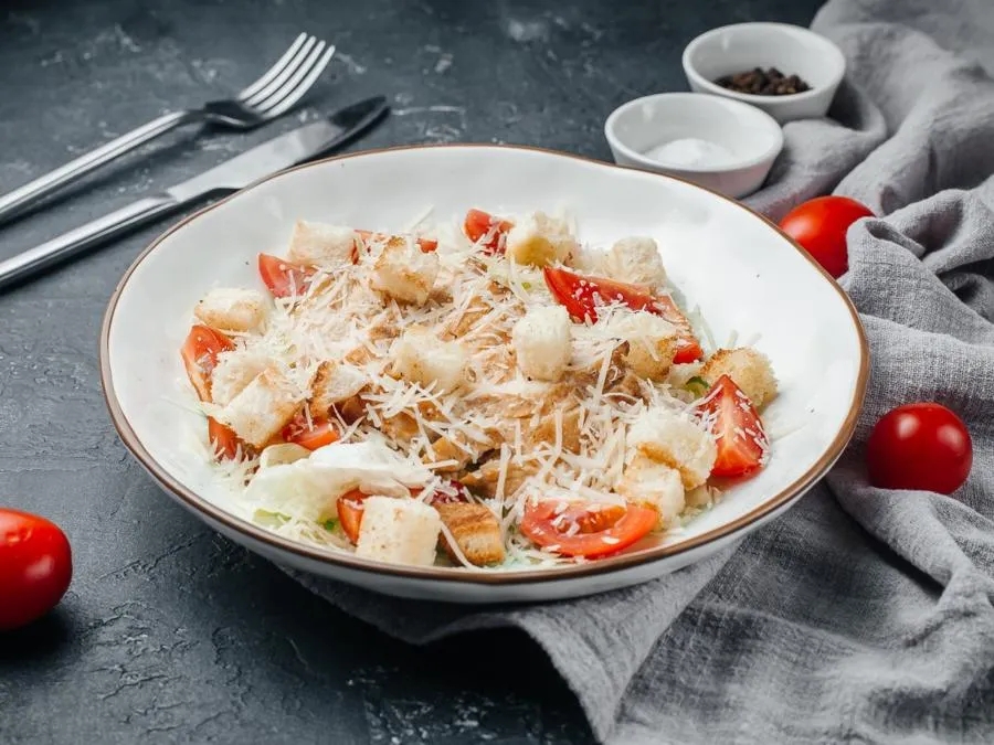 Обжаренная сочная курочка, салат Айсберг, помидоры черри, сыр Пармезан, хрустящие сухарики, соус Цезарь