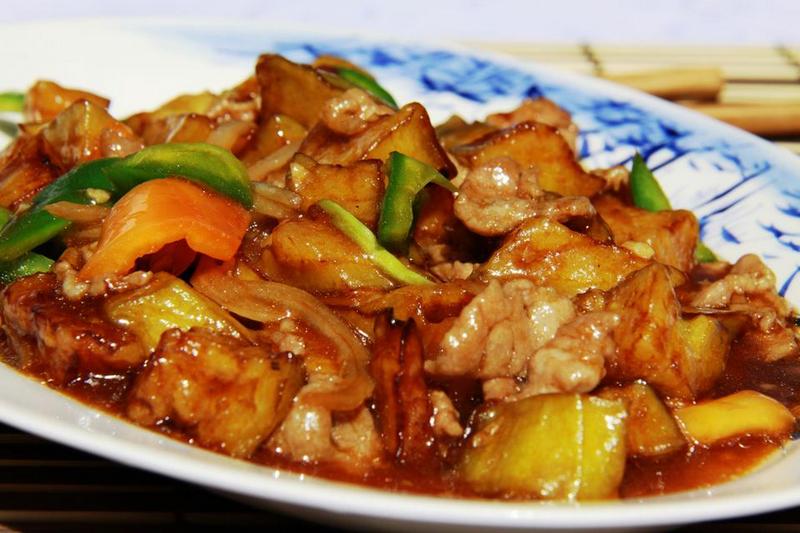 Свинина, картофель, лук репчатый, перец болгарский, соус устричный, соус соевый